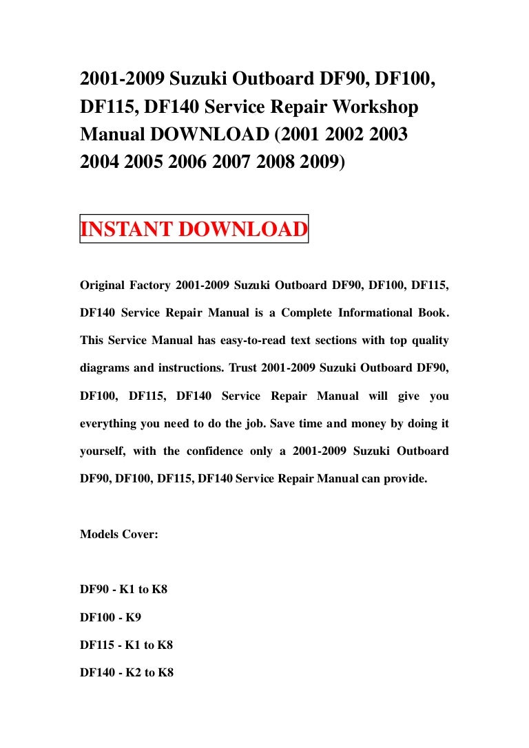 Suzuki outboard motor df40 df50 service repair workshop manual 1999 2011. Suzuki outboard df90 df100 df115 df140 4 stroke service manual. Suzuki outboard motor df90 df100 df115 df140 service repair manual. Complete service repair manual step by step procedures and detailed diagrams illustrations guide you through every repair.